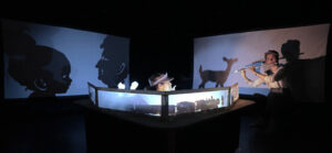 Au cours de la nuit la plus longue de l’année, une petite fille et sa mère montent dans un train pour rejoindre sa grand-mère qui les attend à l’autre bout du pays. Pendant ce long voyage, les paysages défilent devant les yeux émerveillés de l’enfant. Bercée par les chants de sa mère et les roulis du train, elle ne tarde pas à plonger dans un univers fait de rêveries merveilleuses. Grâce à un dispositif original qui joue sur les ombres projetées de papier découpé et des bricolages inventifs, la compagnie Madame Glou réussit à embarquer petits et grands dans un voyage au cœur de l’hiver. Un merveilleux moment pour célébrer la lumière et la douceur d’être ensemble.