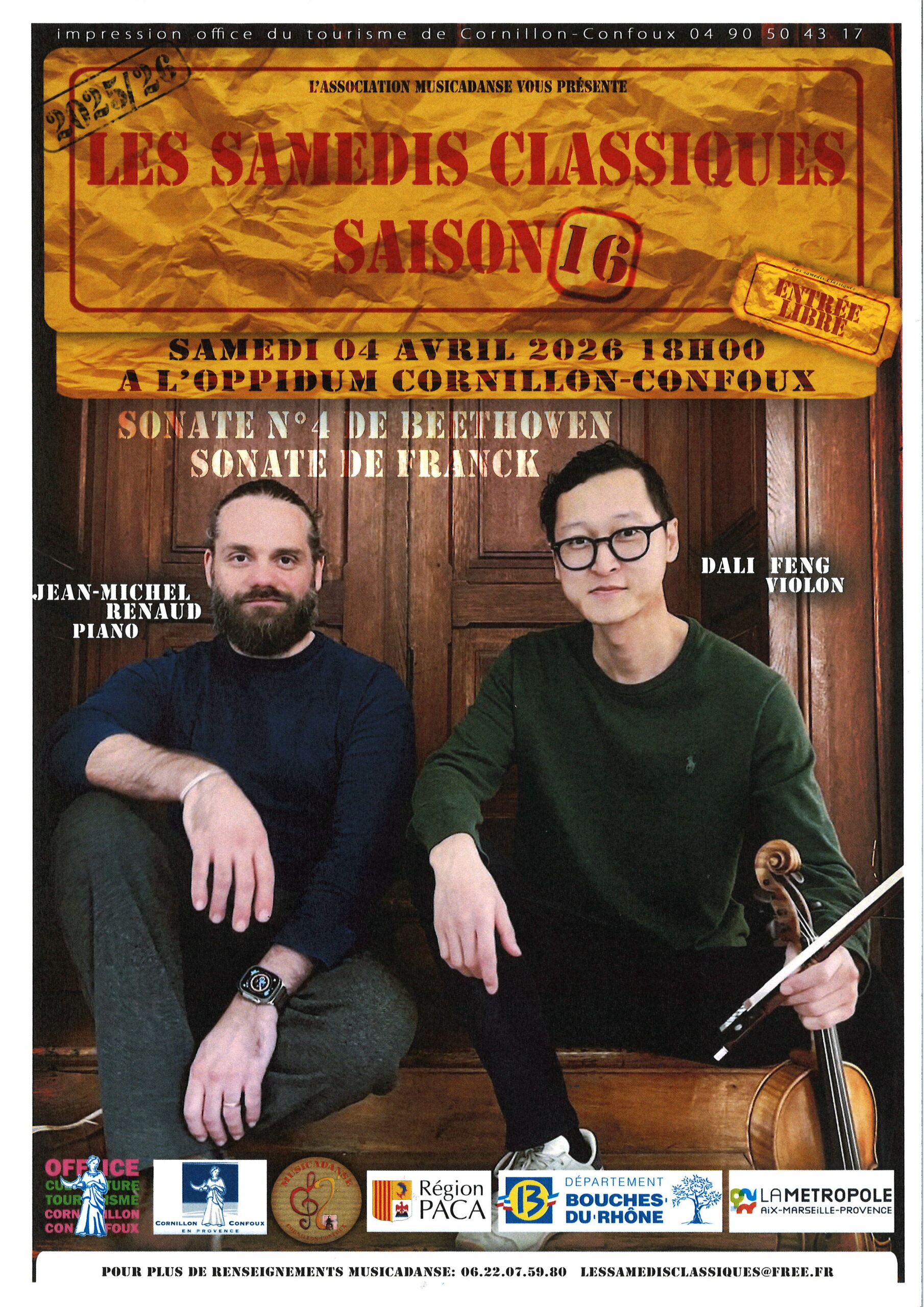 Samedi 04 avril 2026. 18h00. Salle Oppidum Sonates de Beethoven et de Franck Dali Feng ( violon ) ...