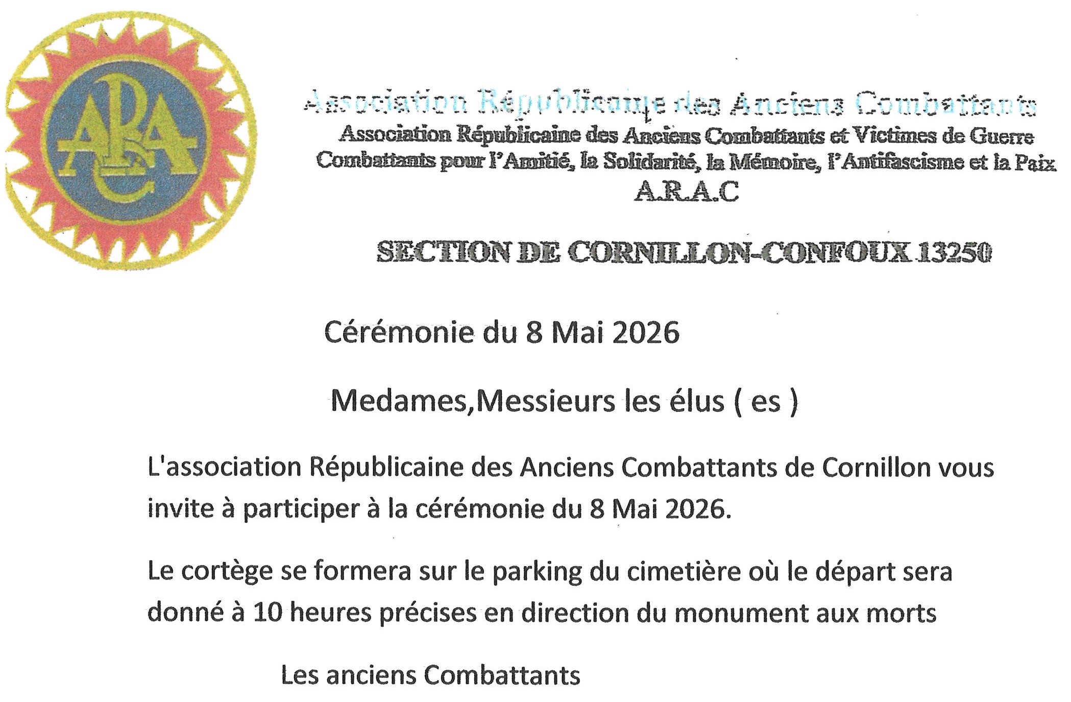 A.R.A.C Association Républicaine des Anciens Combattants Section de Cornillon-Confoux 13250 Cérémonie du 8 mai 2026 L'Association Républicaine des Anciens Combattants ...