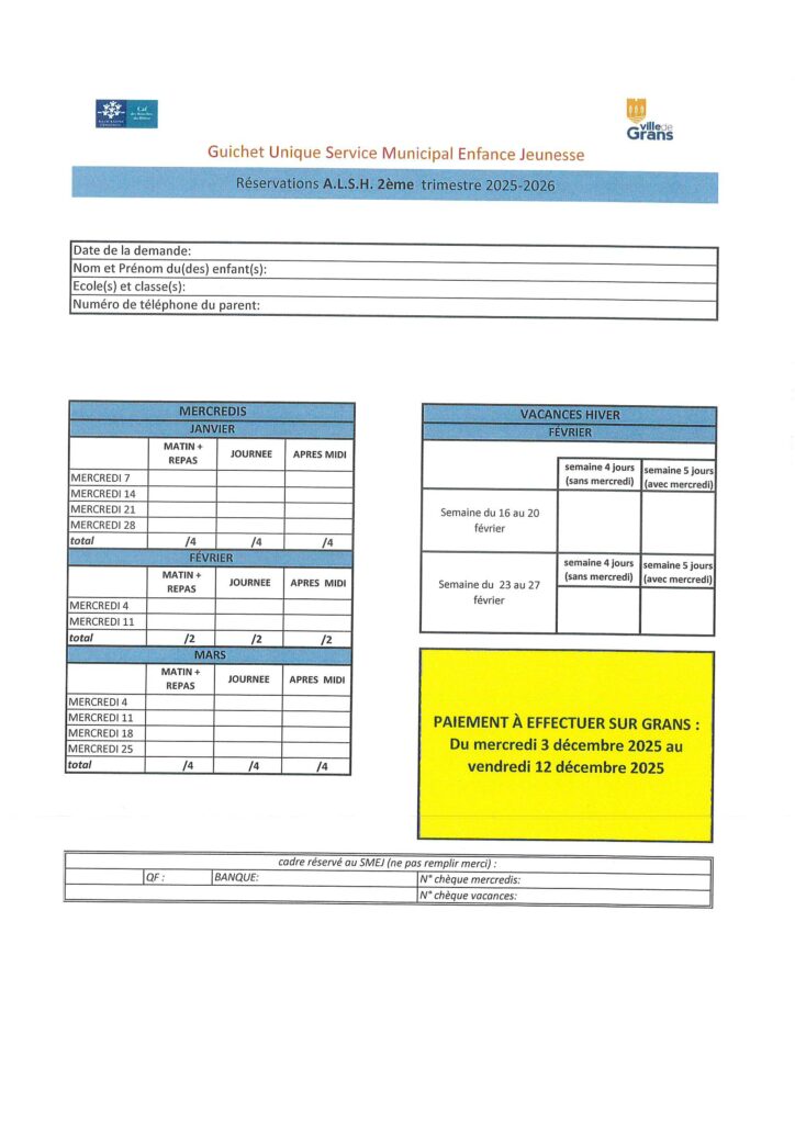 Le paiement s’effectuera à la mairie de Grans entre le mercredi 3 décembre et le vendredi 12 décembre 2025 :