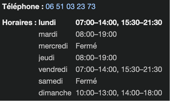 Du lundi au samedi de 8h30 à 12h et de 13h30 à 18h